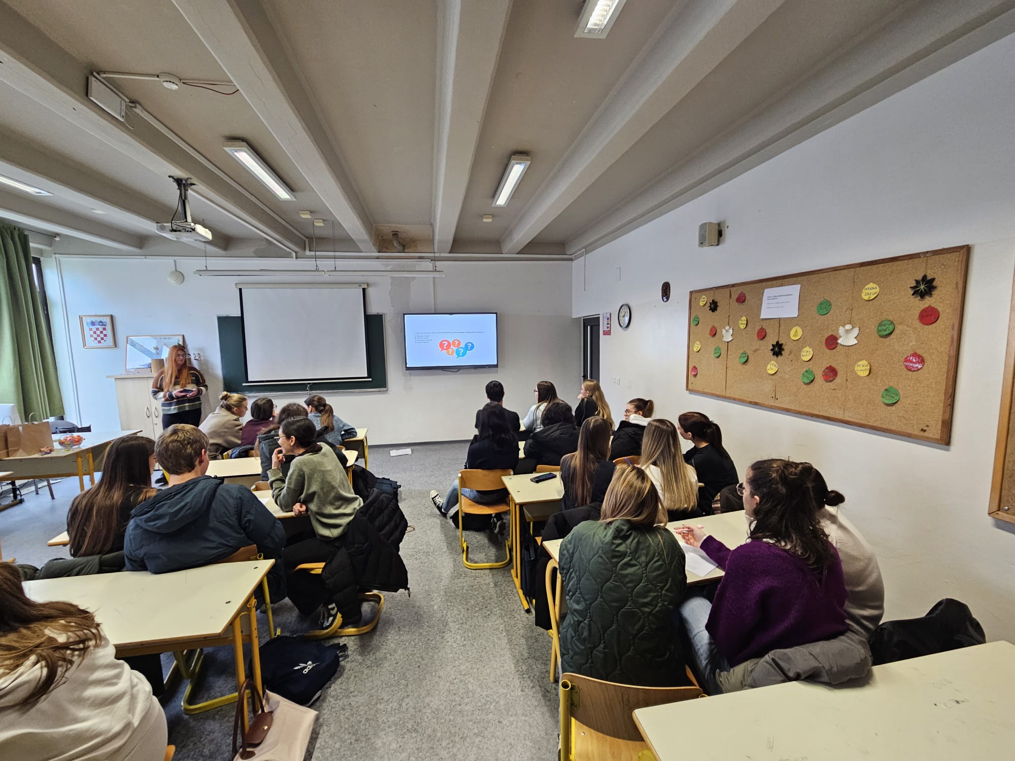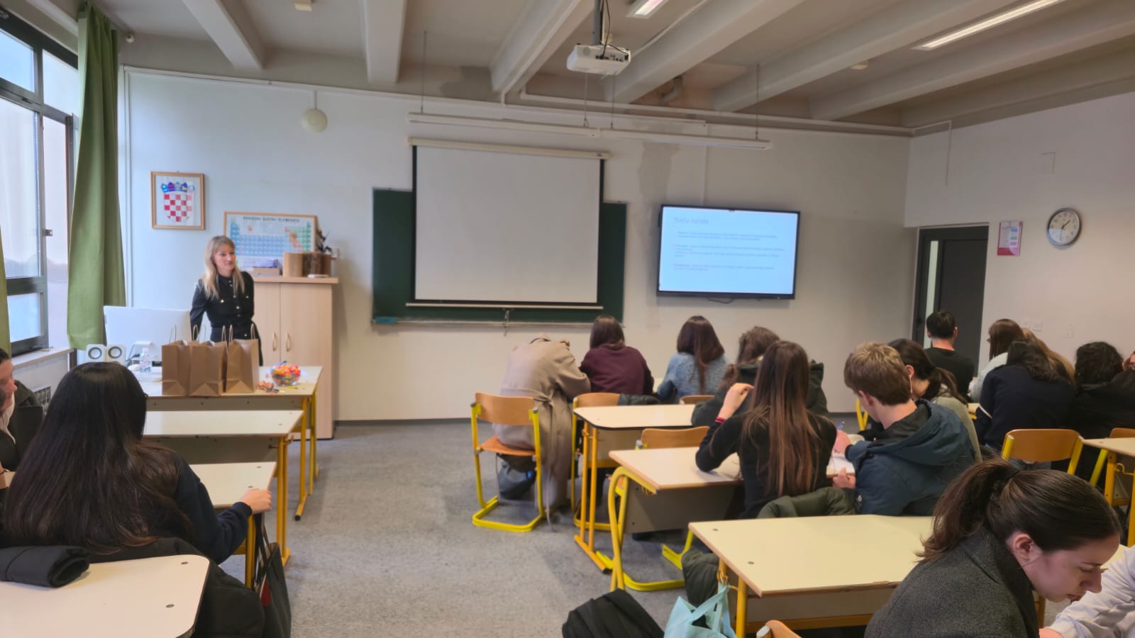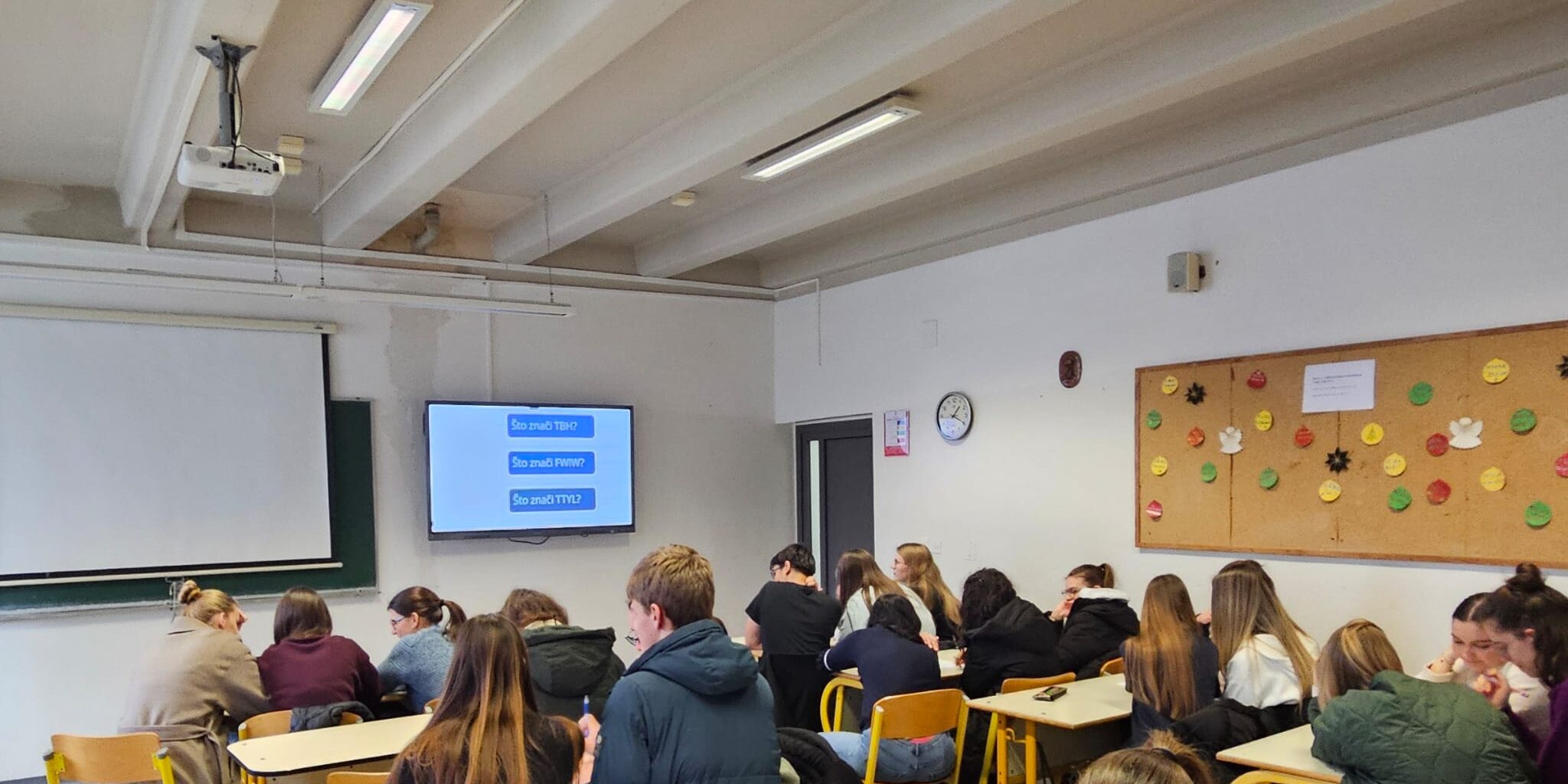 Ovogodišnji Dan sigurnijeg interneta naša škola je proslavila pub kvizom kojeg su osmislile i provele nastavnice Iliana Gudelj i Ivana Miletić. Učenici su u timovima odgovarali na pitanja o sigurnom online okružju i modernim digitalnim trendovima. Borba za bodove trajala je do samog kraja budući da su, među ostalim dobrim rezultatima, 2 tima pokazala odlično poznavanje pojmova vezanih za internet pa je presudilo samo jedno pitanje pred proglašenje pobjednika. Najbolje znanje pokazao je tim iz 4.b, kojem su nastavnice uručile vrijedne nagrade– nove slušalice. Čestitamo!