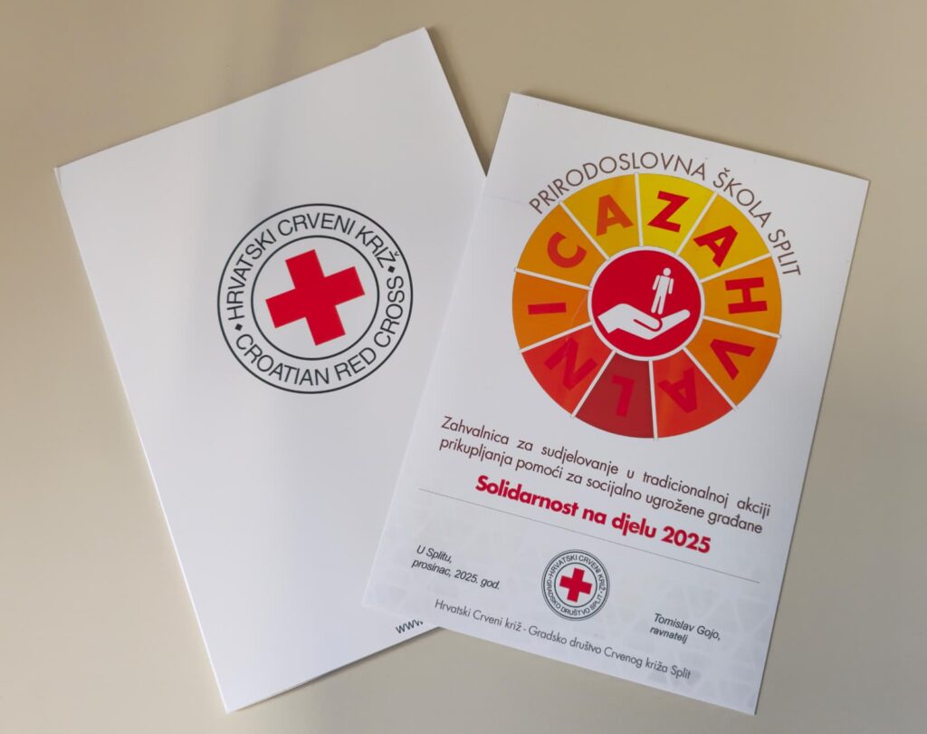 Dana 19. siječnja, u prostorijama Gradskog društva Crvenog križa Split, našoj je Školi dodijeljeno priznanje za sudjelovanje u tradicionalnoj humanitarnoj akciji Hrvatskog Crvenog križa pod nazivom „Solidarnost na djelu“.
