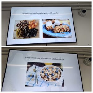 Važnost zdrave prehrane je tema o kojoj se često priča. Svi se slažu da bi malim koracima, uz povremene promjene u prehrani, ubrzo mogli osjetiti i dalekosežne pozitivne posljedice na vlastito zdravlje. Kako bismo svima olakšali odluku na koji način naše prehrambene navike zamijeniti zdravijim varijantama, učenici 1.e razreda zajedno s nastavnicom I.Miletić, pripremili su primjere zdravih obroka koji se temelje na namirnicama biljnog podrijetla. Svi smo dužni brinuti o vlastitom zdravlju, ali često, zbog nedostatka vremena ili ideja, pribjegavamo rafiniranim šećerima, procesuriranim masnoćama ili nisko nutritivnim proizvodima. Zato učenici Prirodoslovne škole Split ovih dana imaju priliku gledati prezentaciju s primjerima zdrave prehrane na školskom TV-u. Nadamo se da će ih potaknuti na zdravije prehrambene izbore.